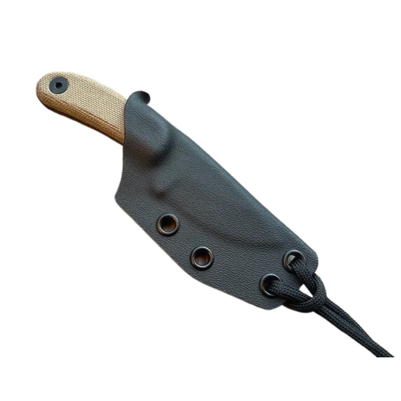 Minimalistyczna osłona na pasek nożowy do lekkiego noża myśliwskiego. Pochwa Kydex jest dostępna w kolorze czarnym Kydex. Pochwę Kydex w standardzie wykonuję z trzema oczkami. Jeśli potrzebujesz więcej lub mniej, możesz to określić podczas procesu zamawiania. Zasadniczo mały nóż jest również bezpiecznie osadzony za pomocą tylko jednego oczka. Aby nosić go na szyi jako nóż na szyję, zaleca się przymocowanie dwóch oczek do końcówki. Jeśli Twój nóż nie posiada podziałki na rękojeści, należy to zaznaczyć przy składaniu zamówienia.